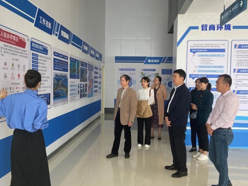 在三亚崖州湾科技城,崖州湾科技城管理局高教合作促进处何雄主任向学校考察组介绍了崖州湾科技城规划展示中心、科技城建设发展现状及园区入驻企业情况。随后,学校考察组前往海南大学三亚南繁研究院实验室参观学习。